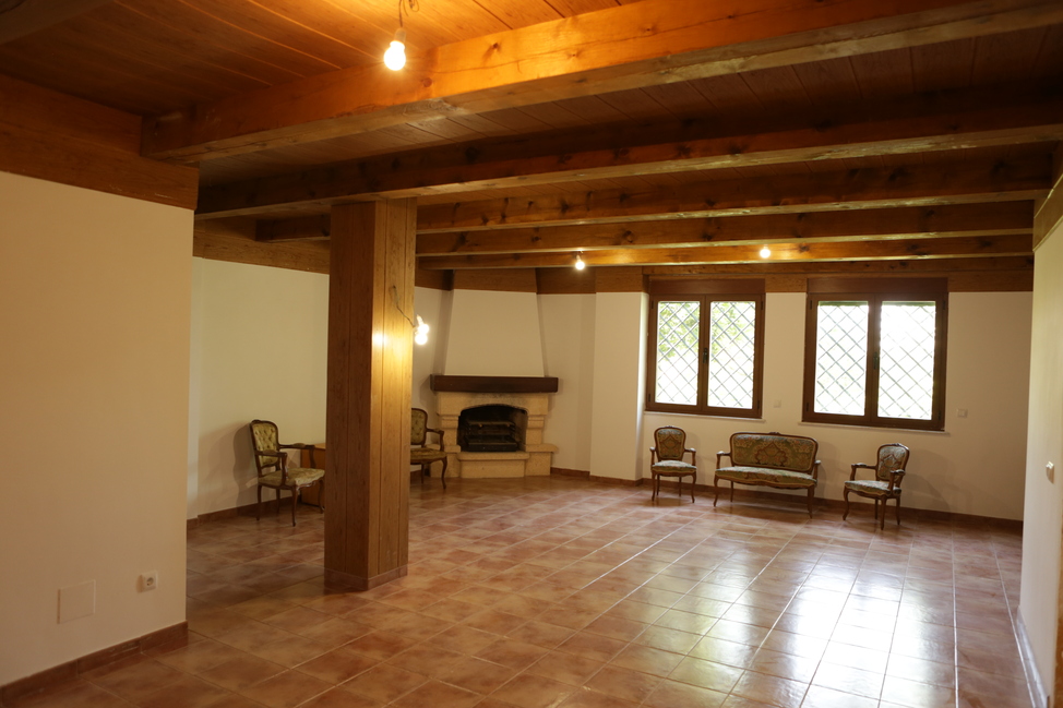 Acceso al jardín con garaje (57 m²), bodega (165 m²) amplia bodega con chimenea y vigas de madera con dos grandes ventanales que dan al jardín. También cuenta con un baño completo, cuarto de limpieza y espacio para calderas. Dispone también de otra estancia grande con muros de hormigón.